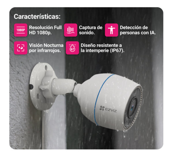 Cámara diseñada para ofrecer una protección confiable durante el día y la noche. Incluye una detección de actividad humana con tecnología de IA, carcasa con diseño resistente a la intemperie, calidad de video nítida, visión nocturna de gran alcance y mucho más.